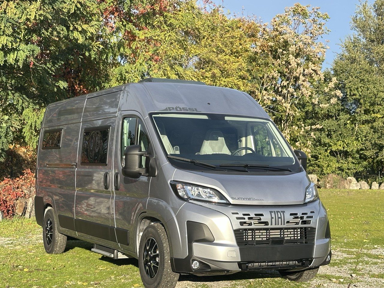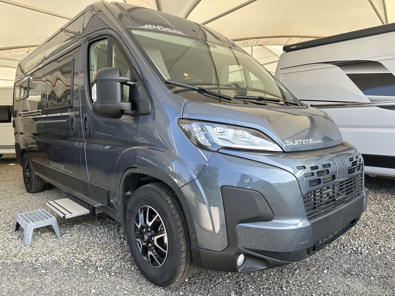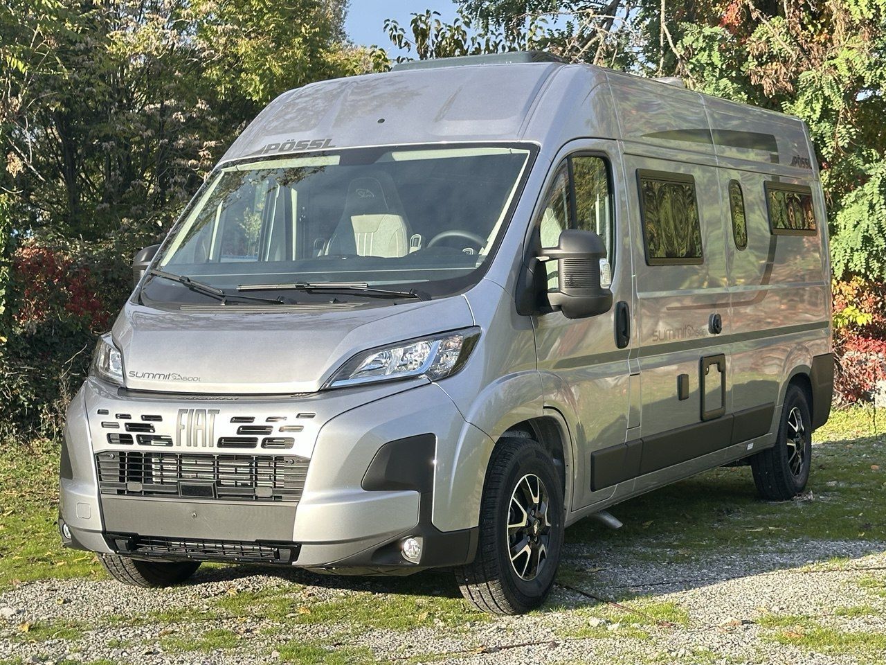 POSSL SUMMIT 600 PLUS su FIAT cv.140: Van 4 posti viaggio, con letto matrimoniale posteriore, ampia dinette con prolunga tavolo e terzo letto, frigorifero apribile da ambo i lati, Bagno con finestra con doccia traslabile, riscaldamento Truma Diesel, comando Truma Inet X, pacchetto Inverno, attacco Isofix, set di prese aggiuntive.