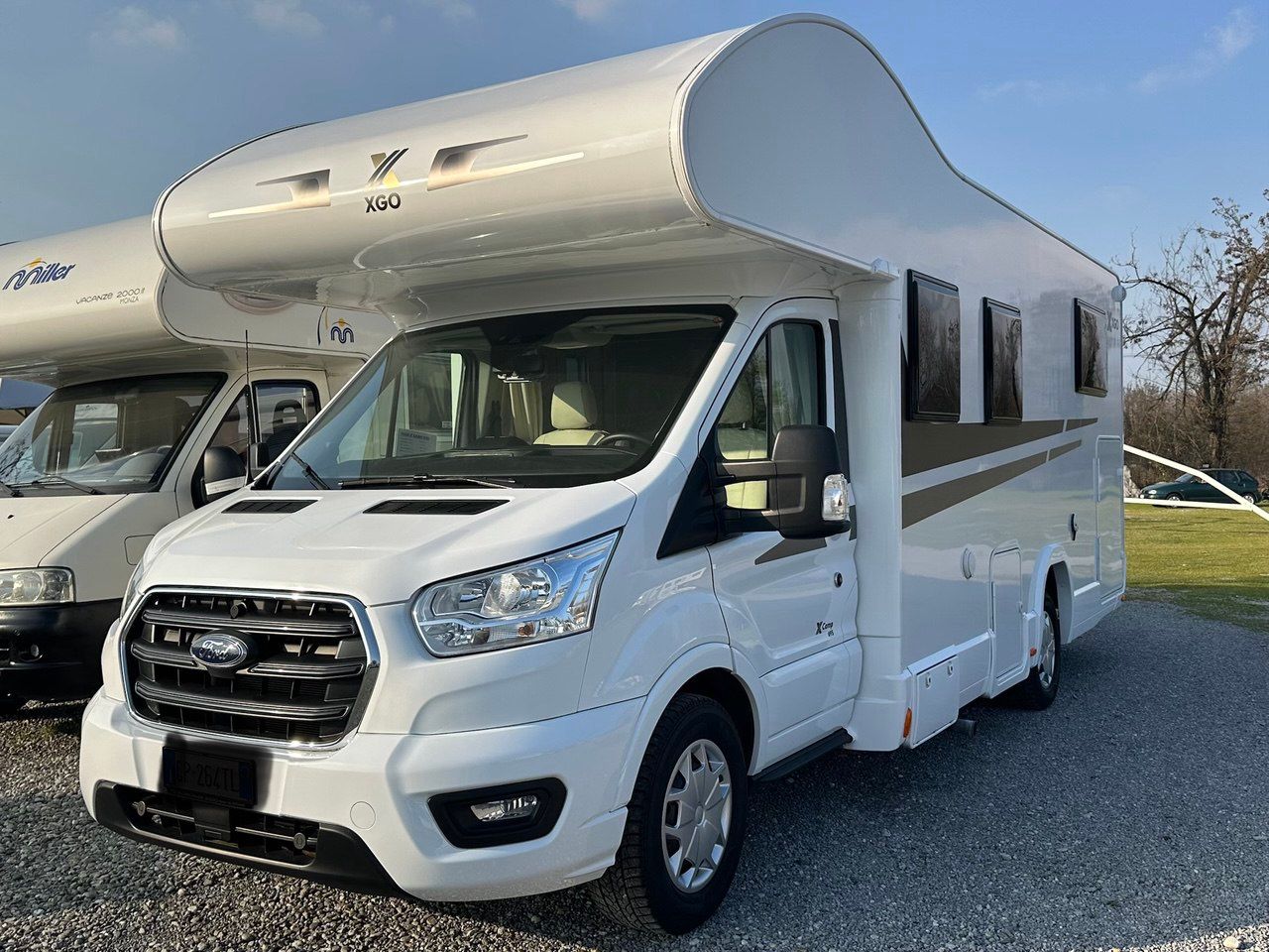 Mansardato XGO X CAMP 695 su Ford cc. 2000 cv.155 Anno 2023 mt 7,35 x 2,35 postin omologati 5, posti letto 6, KM 15.000 Disposizione interna: letto matrimoniale in mansarda + dinette centrale con sedili guida girevoli + letto matrimoniale posteriore con sotto ampio garage portamoto + bagno trsversale con box doccia separato . ACCESORI MONTATI: