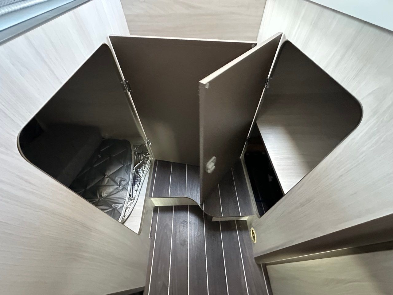 Letto matrimoniale + ampia dinette centrale+ Baggno con box doccia separato.
