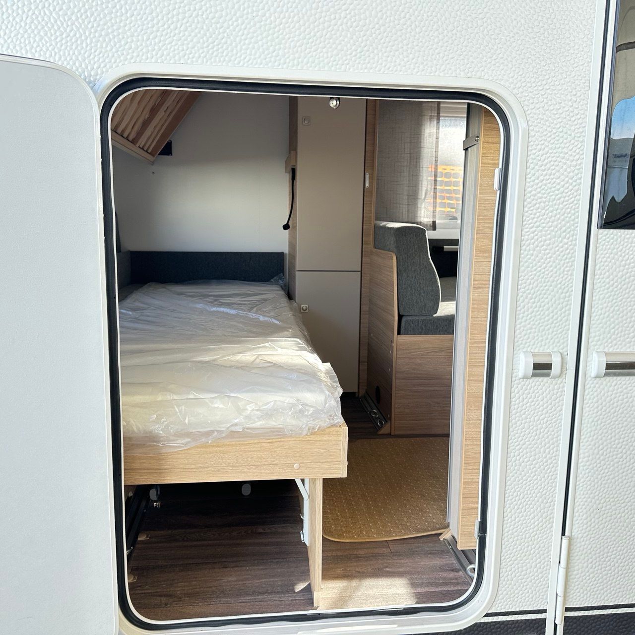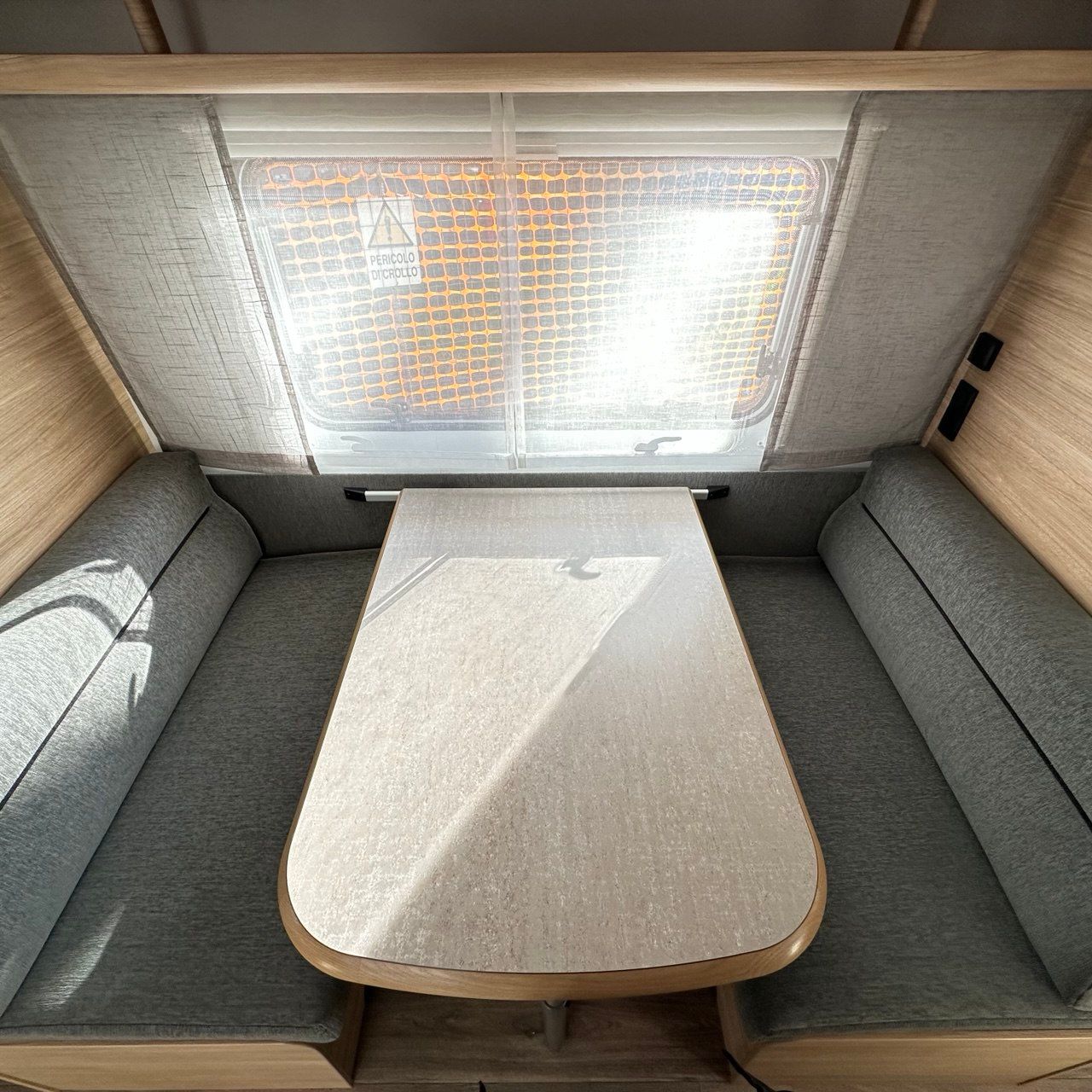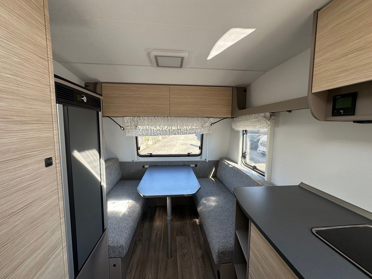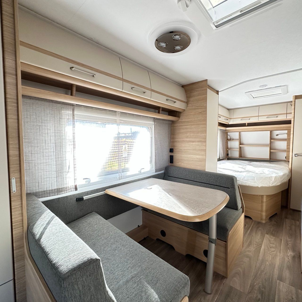 Letto Matrimoniale con doghe, ampio gavone sottostante, dinette a ferro di cavallo, camera da bagno con box doccia separato. Tutto il confort che cerchi in una caravan!