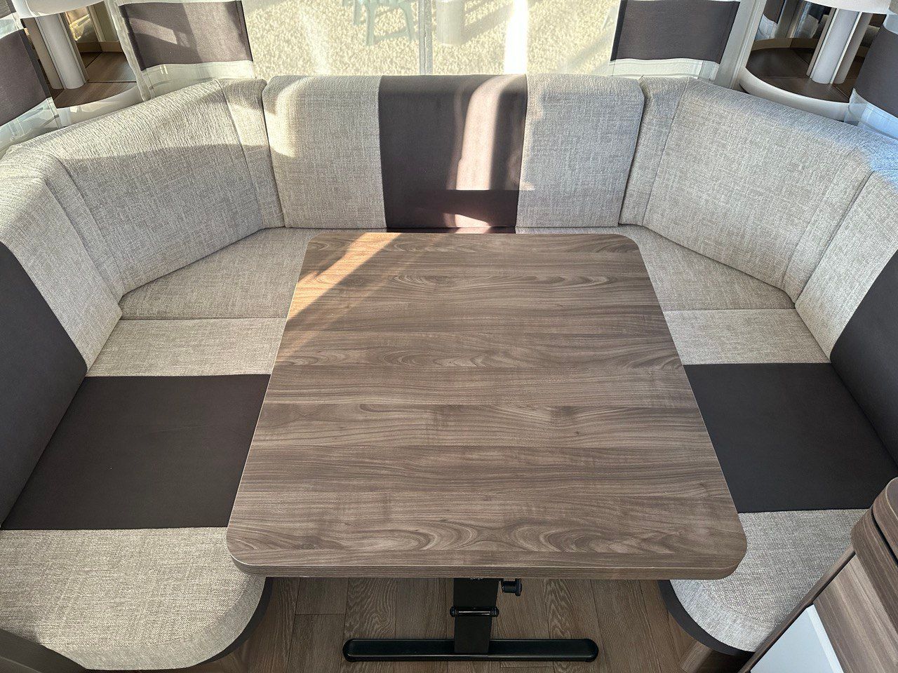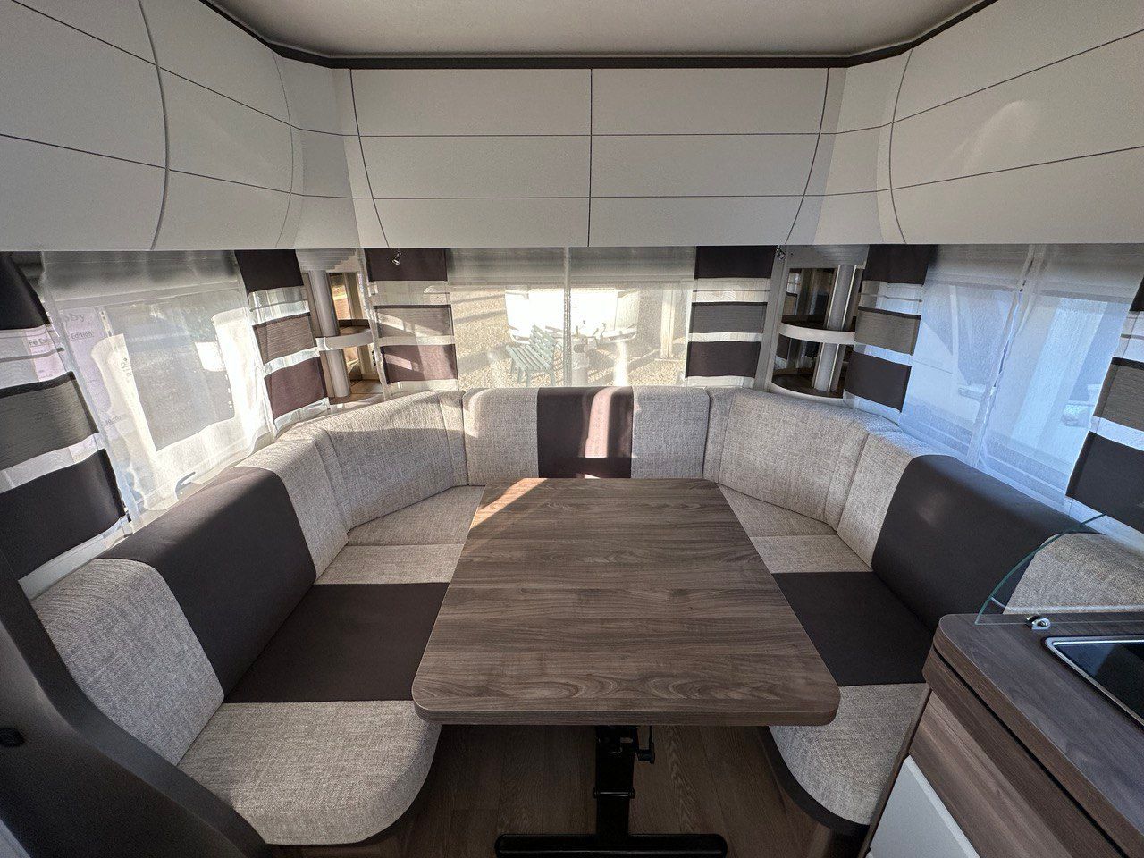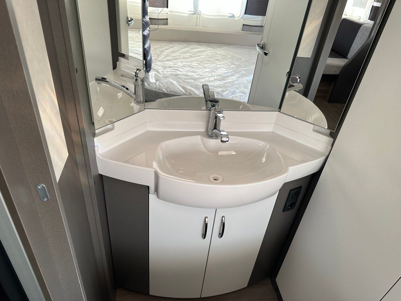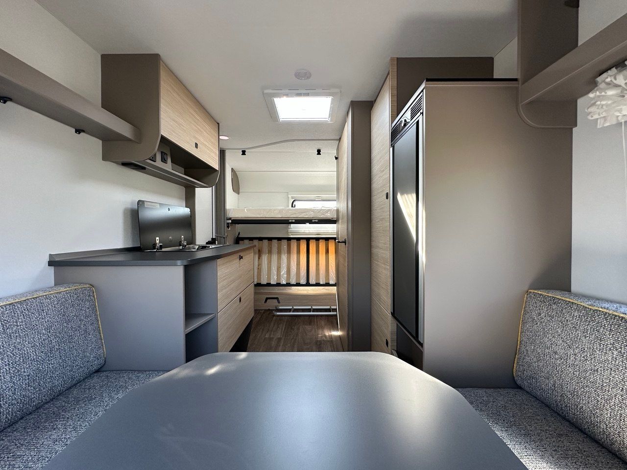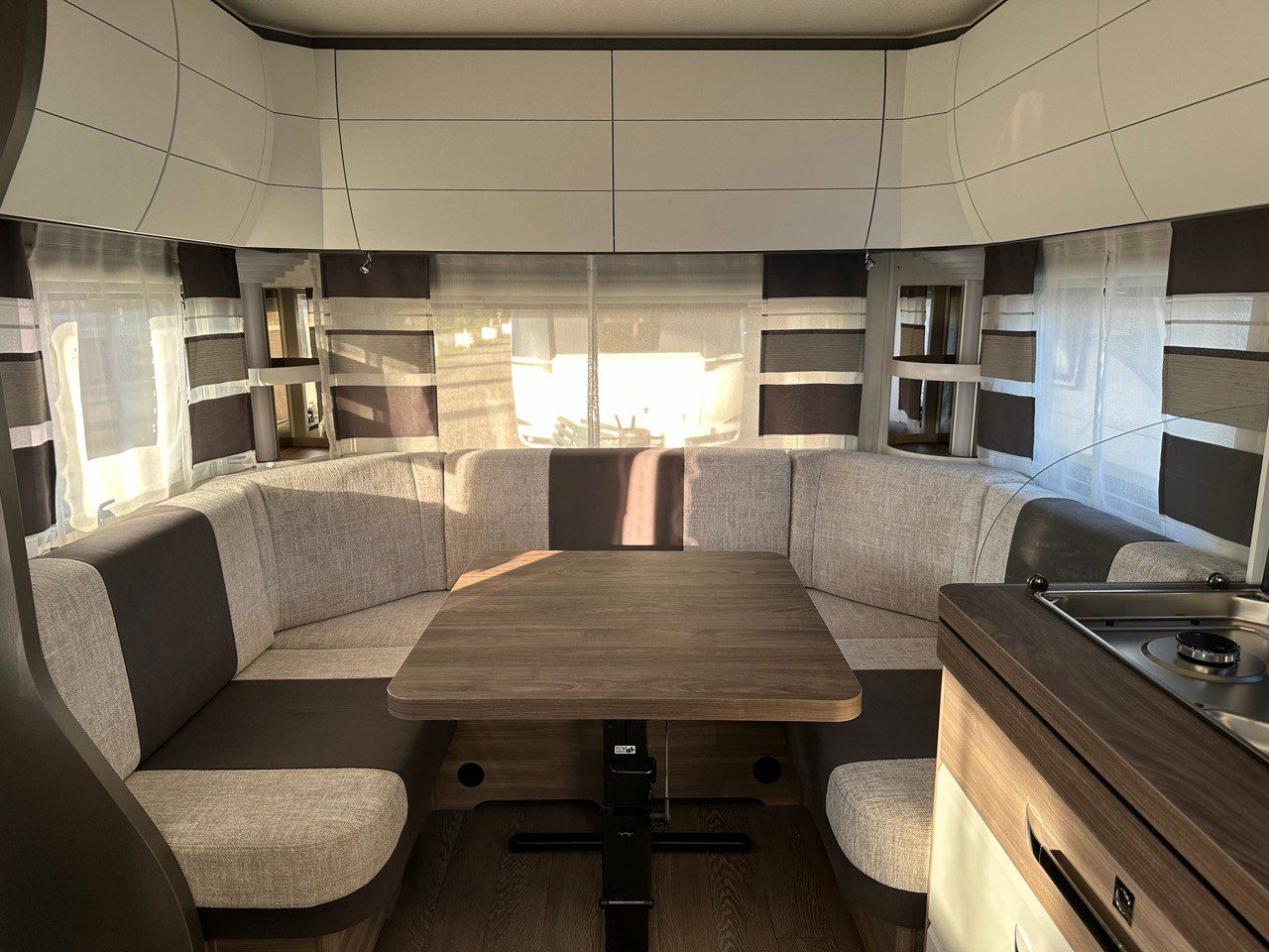 Letto Matrimoniale con doghe, ampio gavone sottostante, dinette a ferro di cavallo, camera da bagno con box doccia separato. Tutto il confort che cerchi in una caravan!