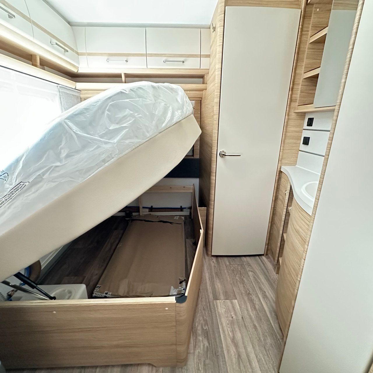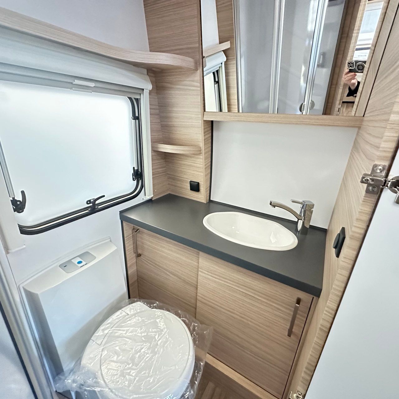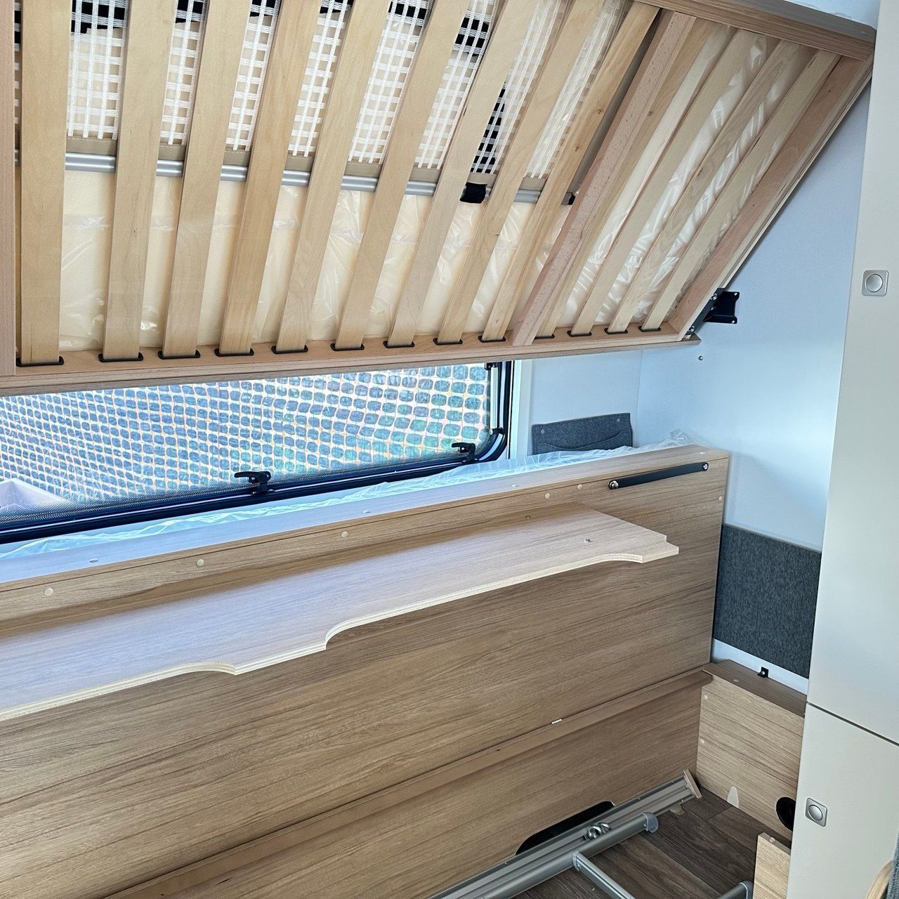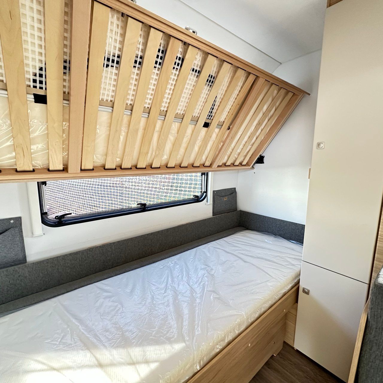 Letto Matrimoniale con doghe, ampio gavone sottostante, dinette a ferro di cavallo, camera da bagno con box doccia separato. Tutto il confort che cerchi in una caravan!