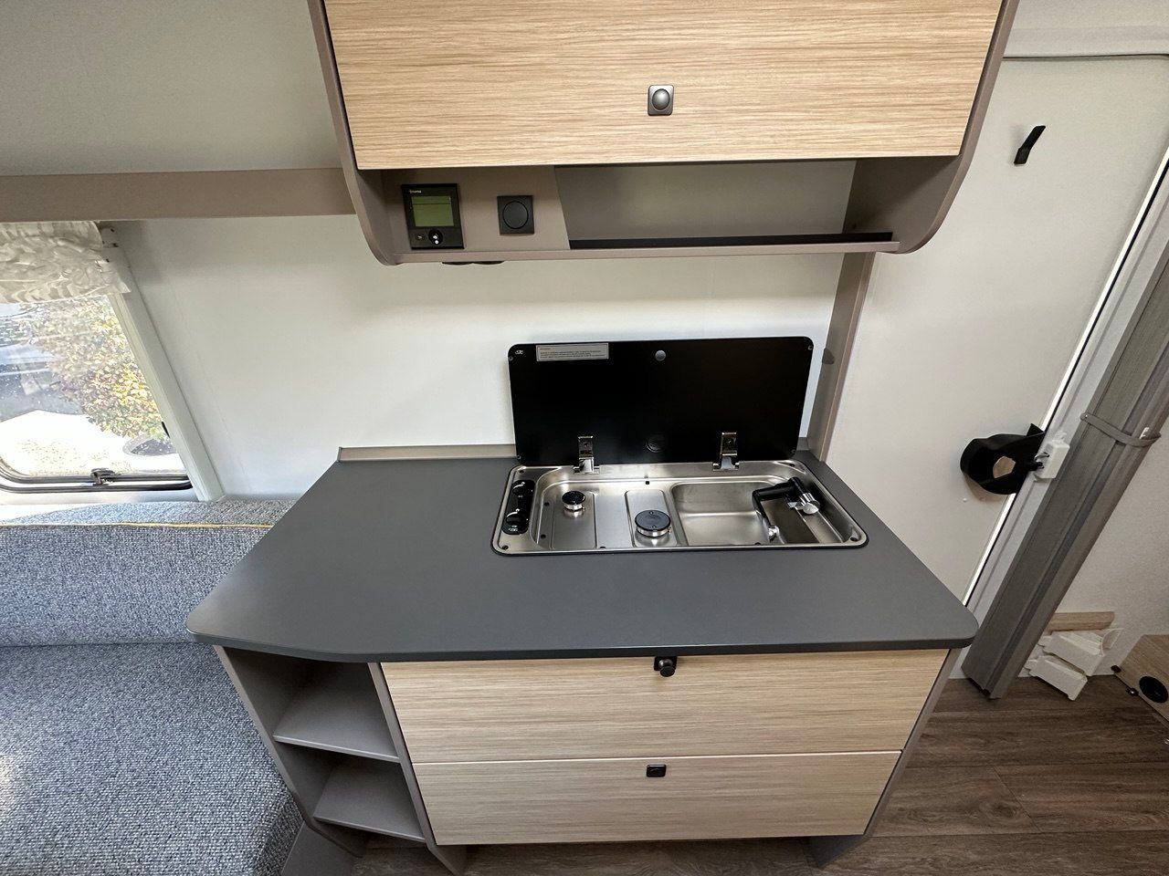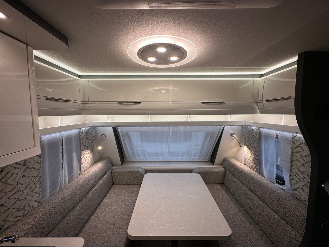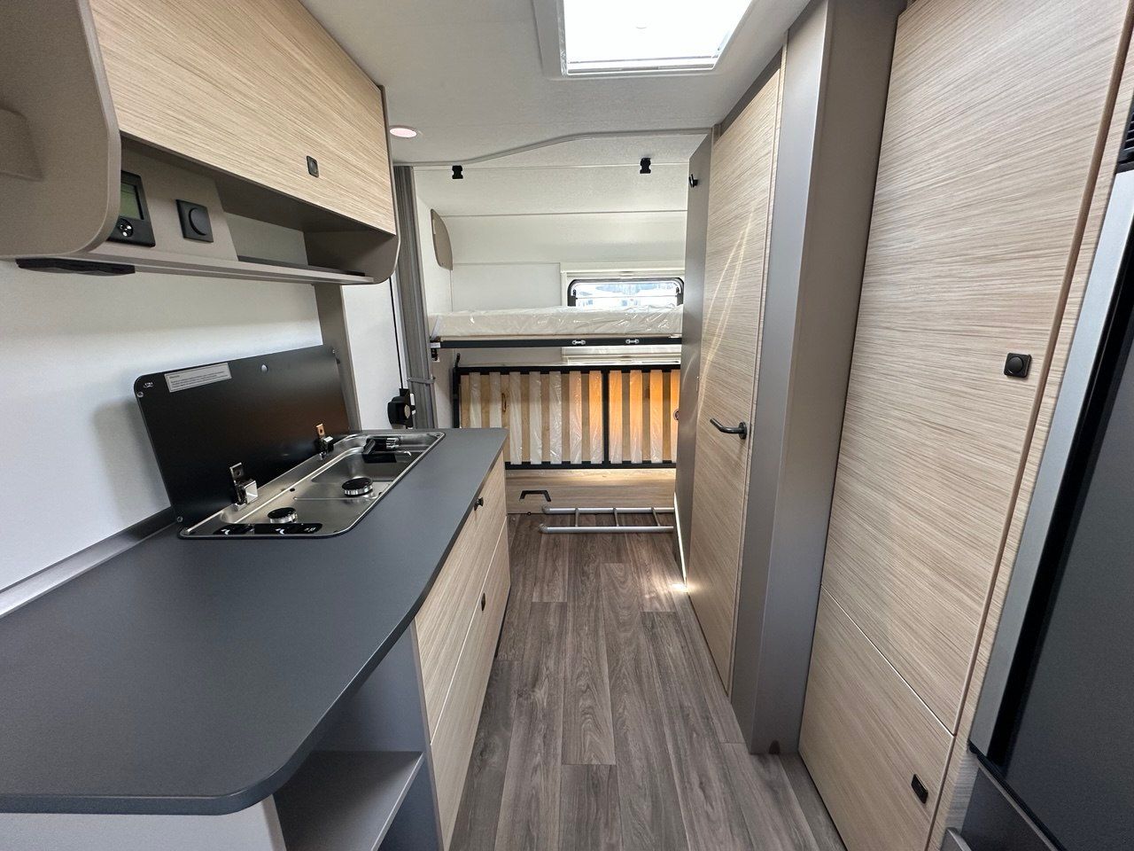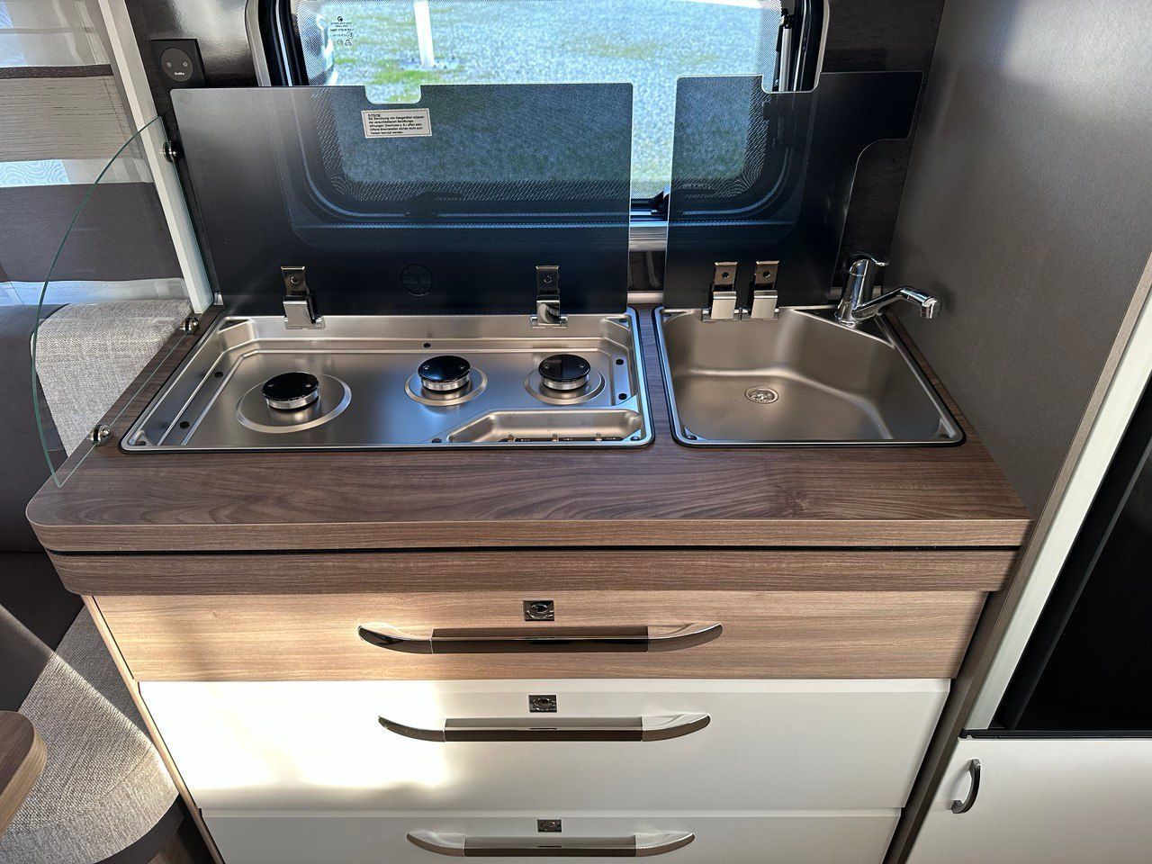 Dotata di stufa Truma, cucina funzionale con 3 fuochi, frigorifero 130 l. e numerosi vani contenitivi.