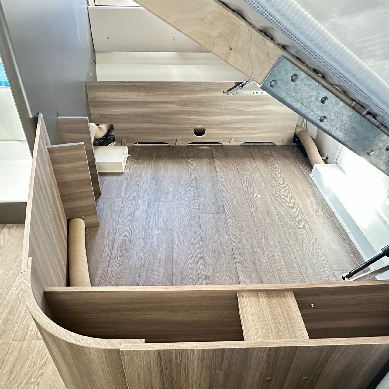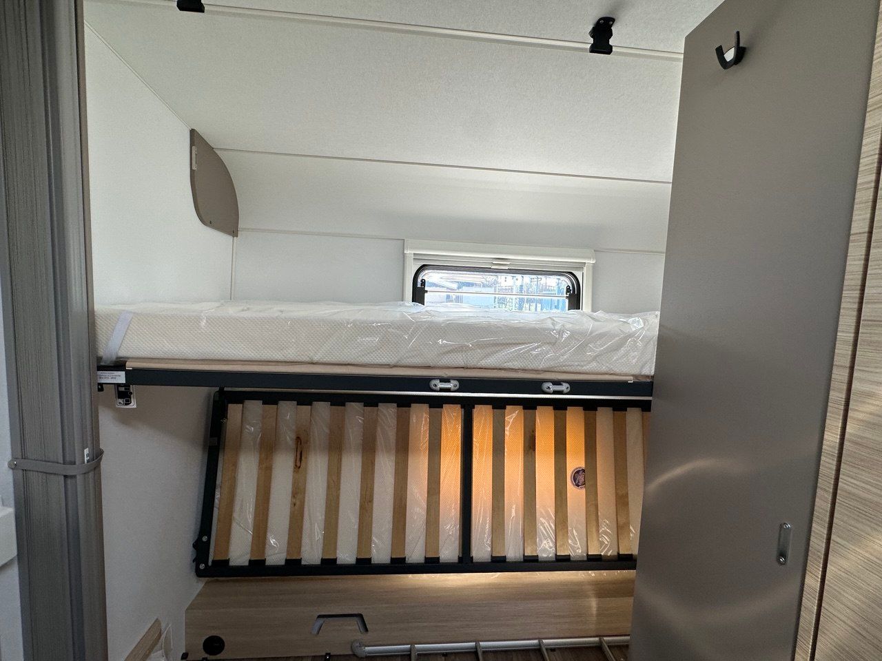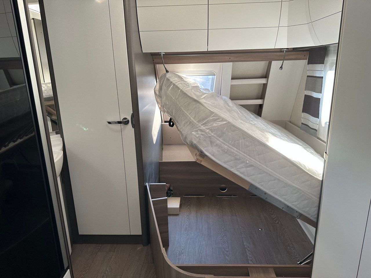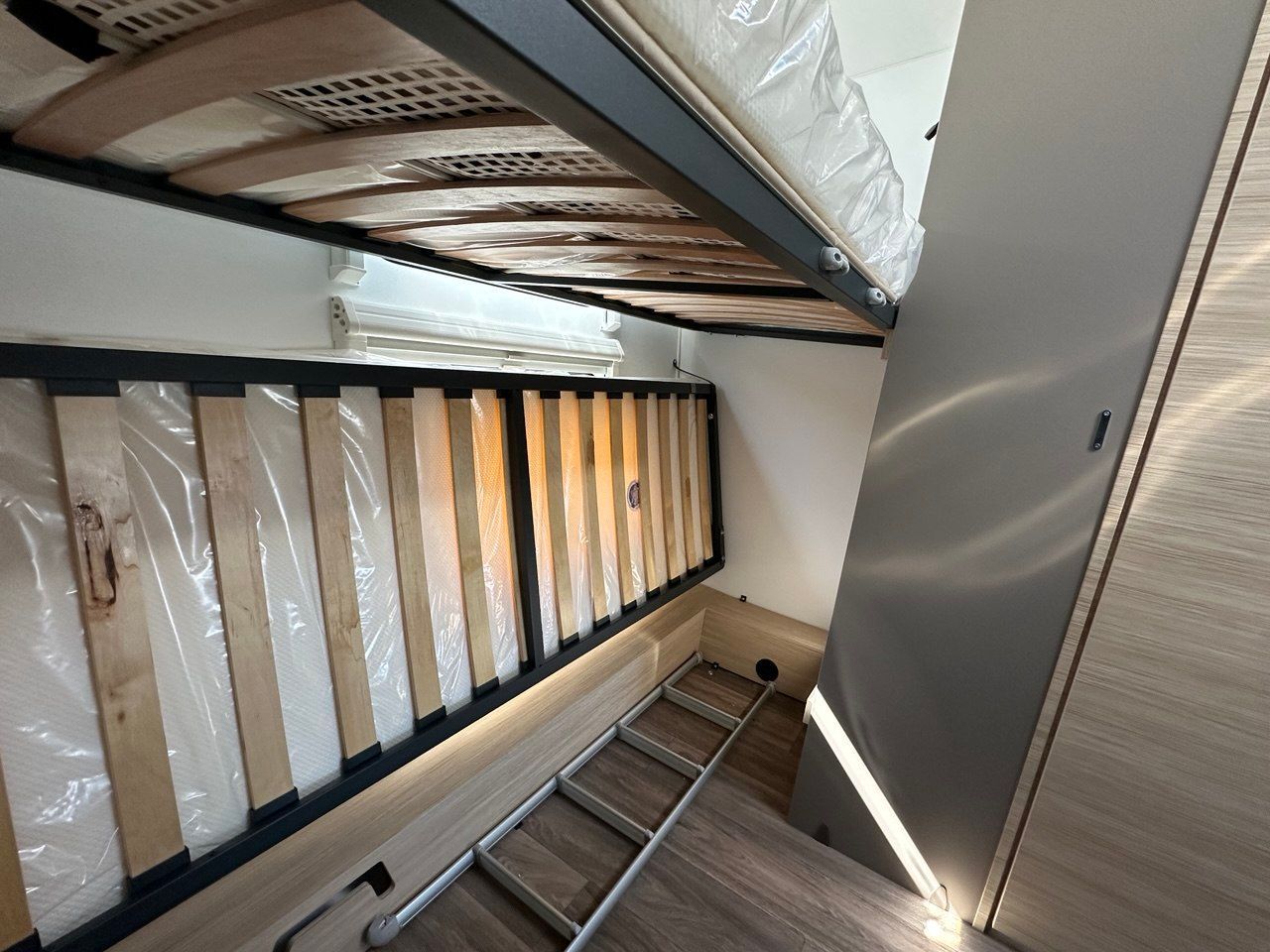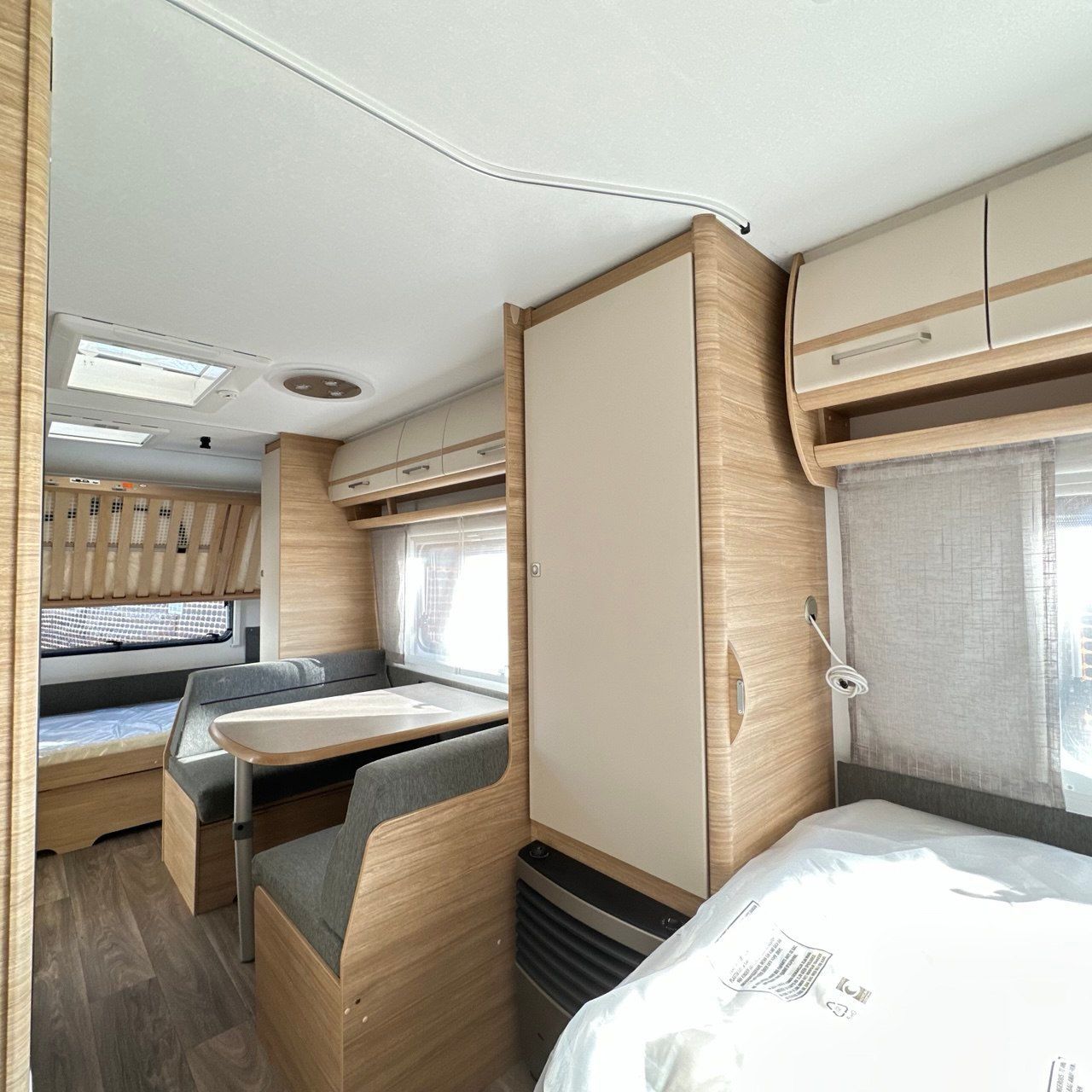 Disposizione interna: girodinette anteriore + Letti gemell posteriori con sistema amapliamento doghe per trasformare letti singoli in matrimoniale.