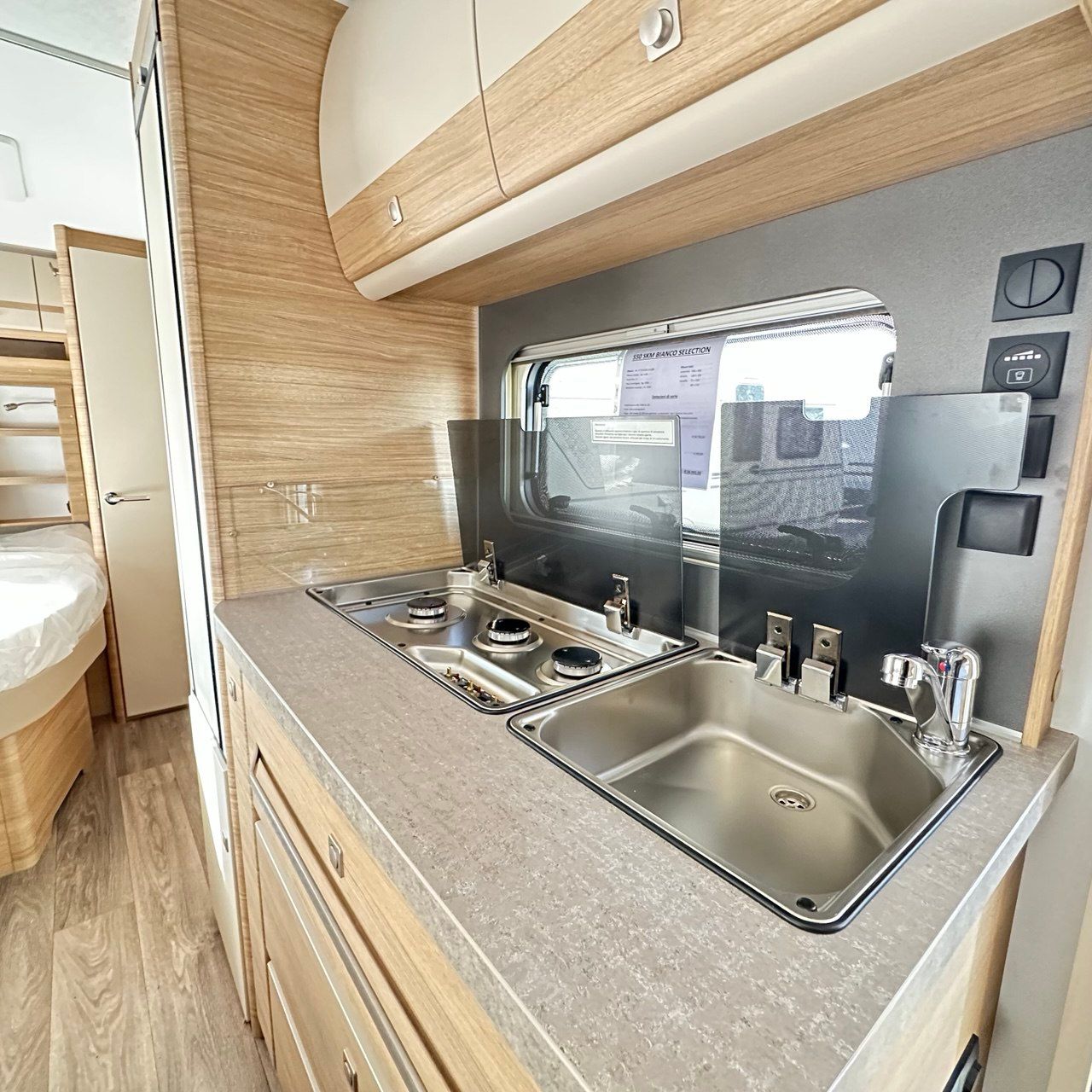 ACCESSORI DI SERIE: Giunto antisbandamento KNOTT, Sistema frenante ad inerzia KNOTT ANS con regolazione automatica dei freni, dispositivo per la misurazione del peso sul ruotino anteriore, Coritimone, Ammortizzatori, Stufa Truma S 3004 con Termoventilazione, Boiler Truma, Frigorifero Super Slim Tower Dometic 140l. con congelatore estraibile 15l. ACCESSORI OPTIONAL: Prolunga Letti Gemelli.
